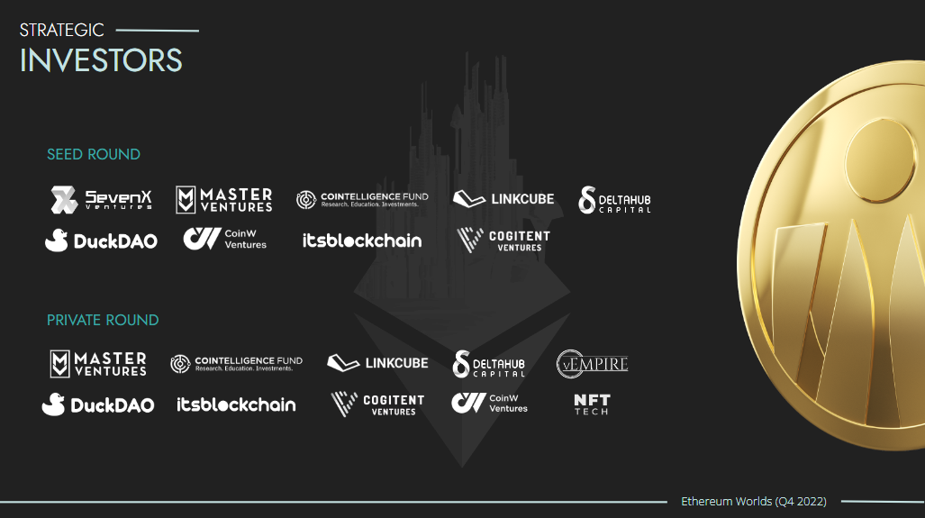<figure><img src="https://3685017275-files.gitbook.io/~/files/v0/b/gitbook-x-prod.appspot.com/o/spaces%2FlCf8JgOre5LNmLunr9S6%2Fuploads%2F4fK1VcLSXeZk9Dfgb3fm%2FStrategicInvestors.png?alt=media&#x26;token=2127418a-a1ee-434e-8675-c86989d19db2" alt=""><figcaption><p>Ethereum Worlds Strategic Investors</p></figcaption></figure>